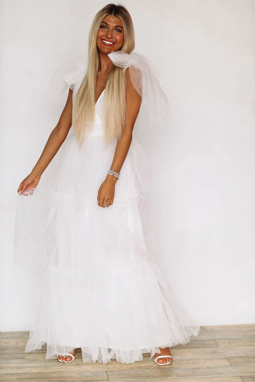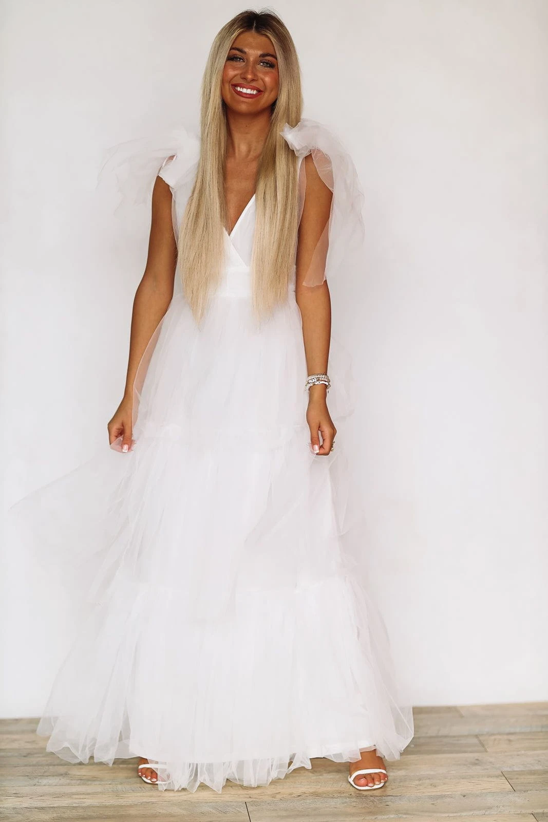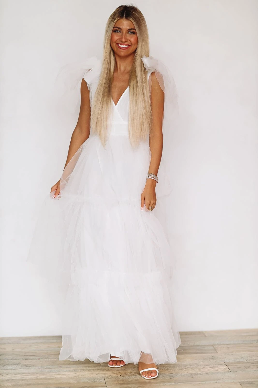 How adorable is this maxi dress gown that is perfect for events this season! This dress is giving designer vibes featuring tie tulle straps, tulle mesh and tiered ruffle detailing.Â