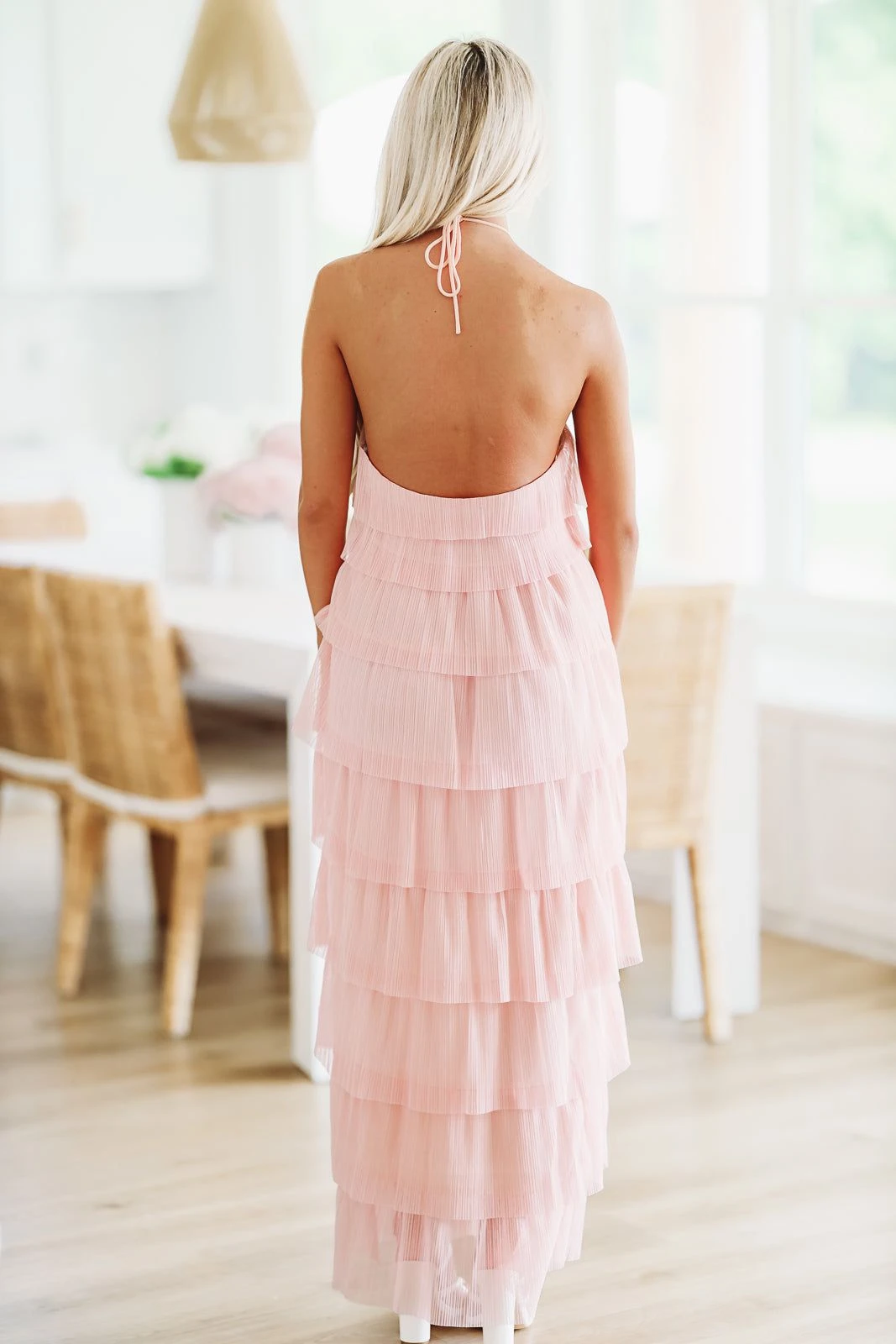 How stunning is this designer dupe gown? It is perfect for wedding guest! We love the tulle ruffle details and halter neck.