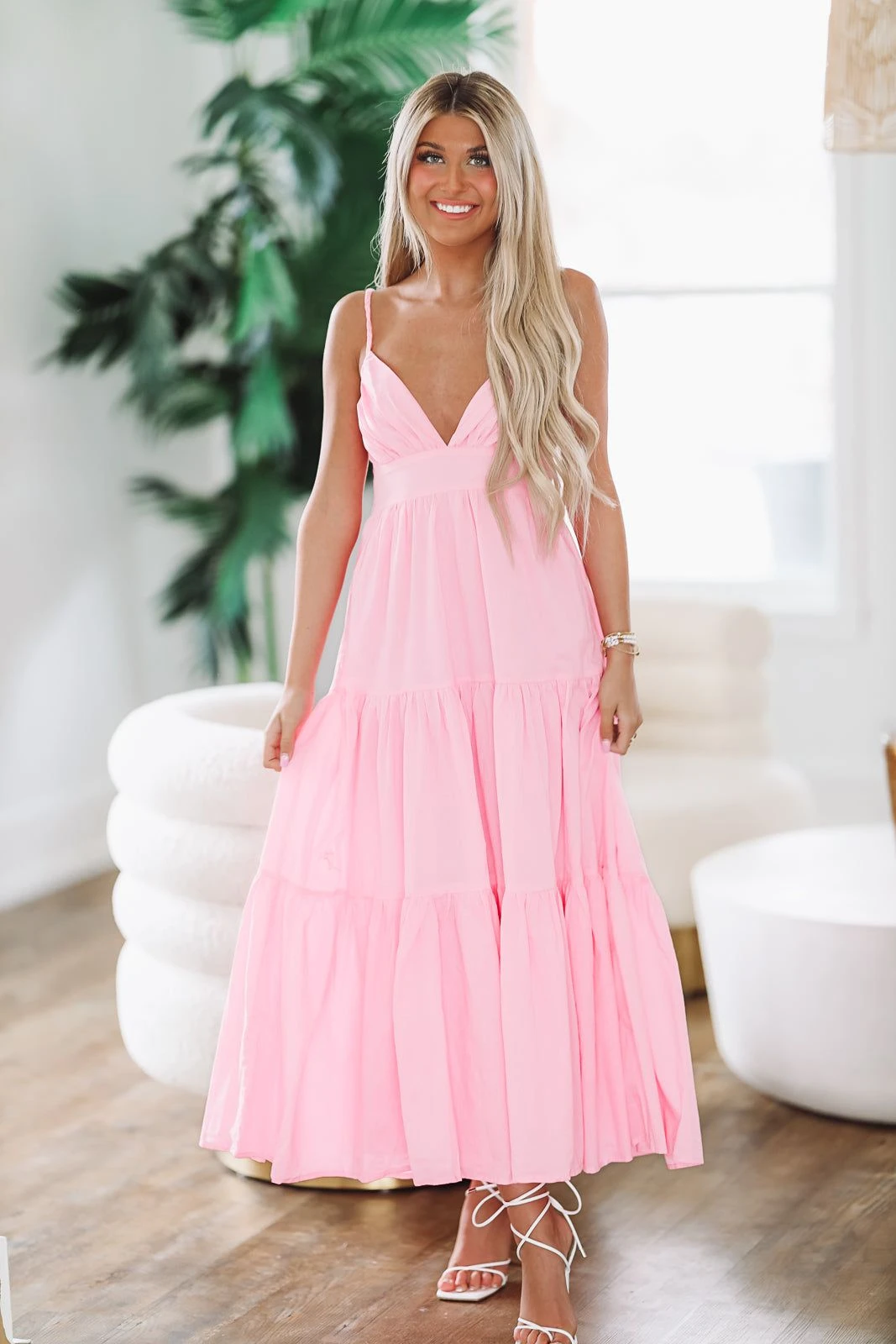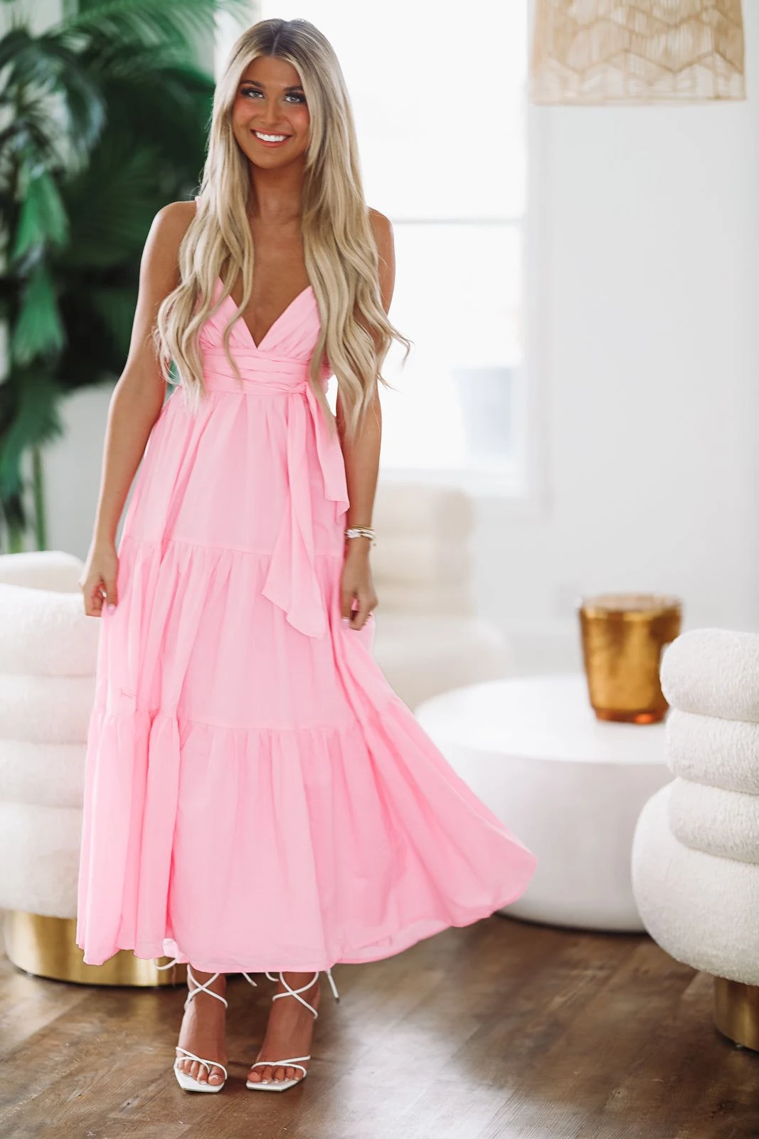 The perfect brunch or shower maxi dress! We love how you can tie the bow different ways.Â