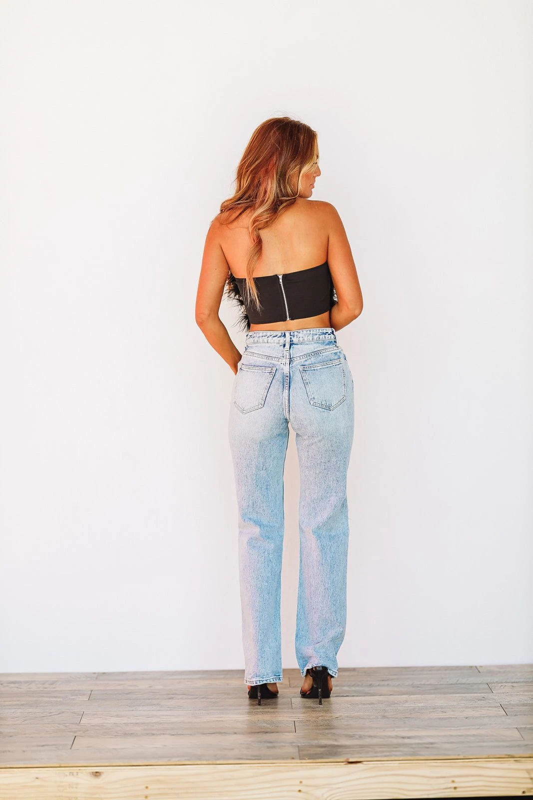 How cute is this trendy crop top? It is a tube top covered in soft faux feathers. Pair it with our highwaisted jeans to complete the look for a night out!Â