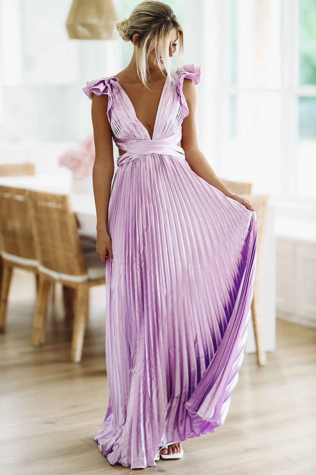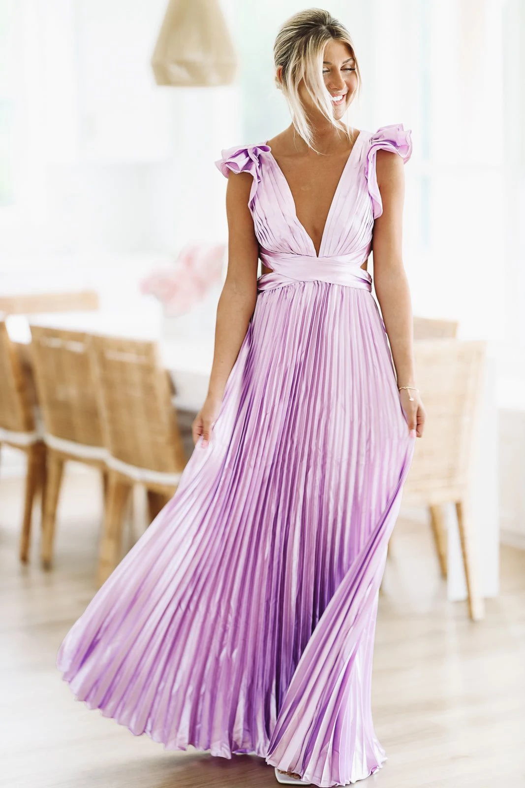 Pleated ruffle maxi gown that is the perfect wedding guest dress! We love the deatiling of this dress and that it is a designer dupe for far less!Â