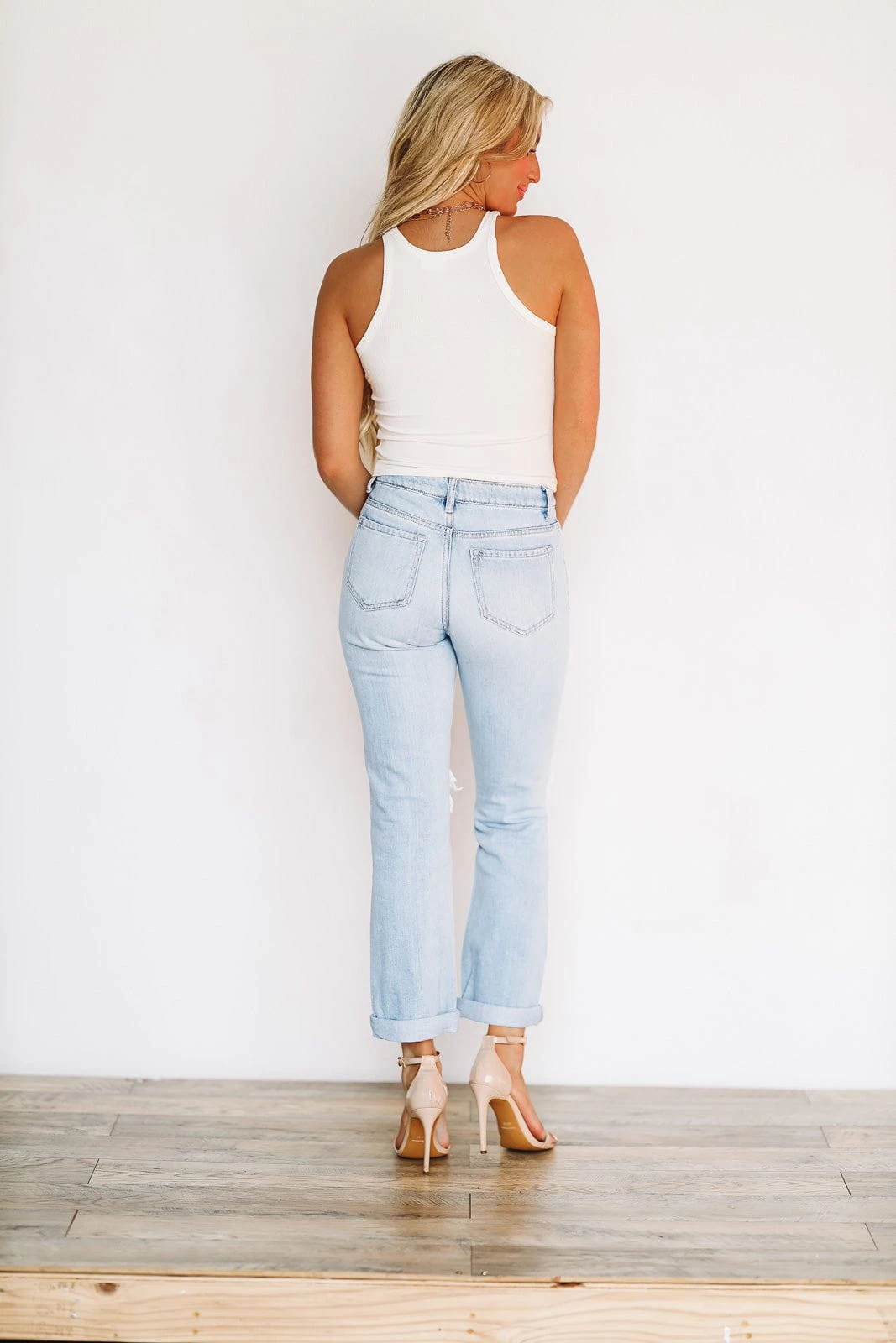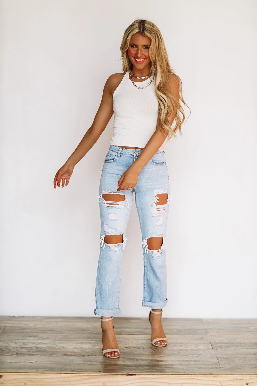 High rise lightly distressed boyfriend jeans with rolled cuff. Pair these comfy super soft jeans with any of your favorite tops!Â