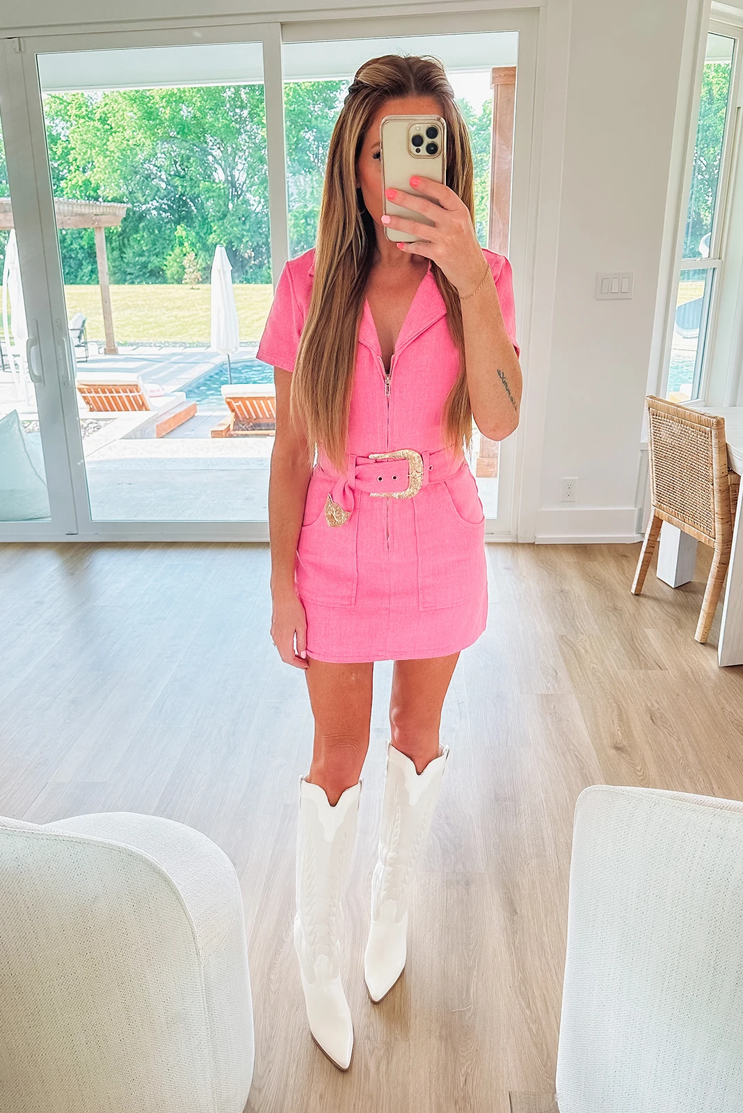 This soft jean denim dress is a designer dupe that we are loving! The chunky gold western belt is so flattering and we love how it has a zipper in the front.
