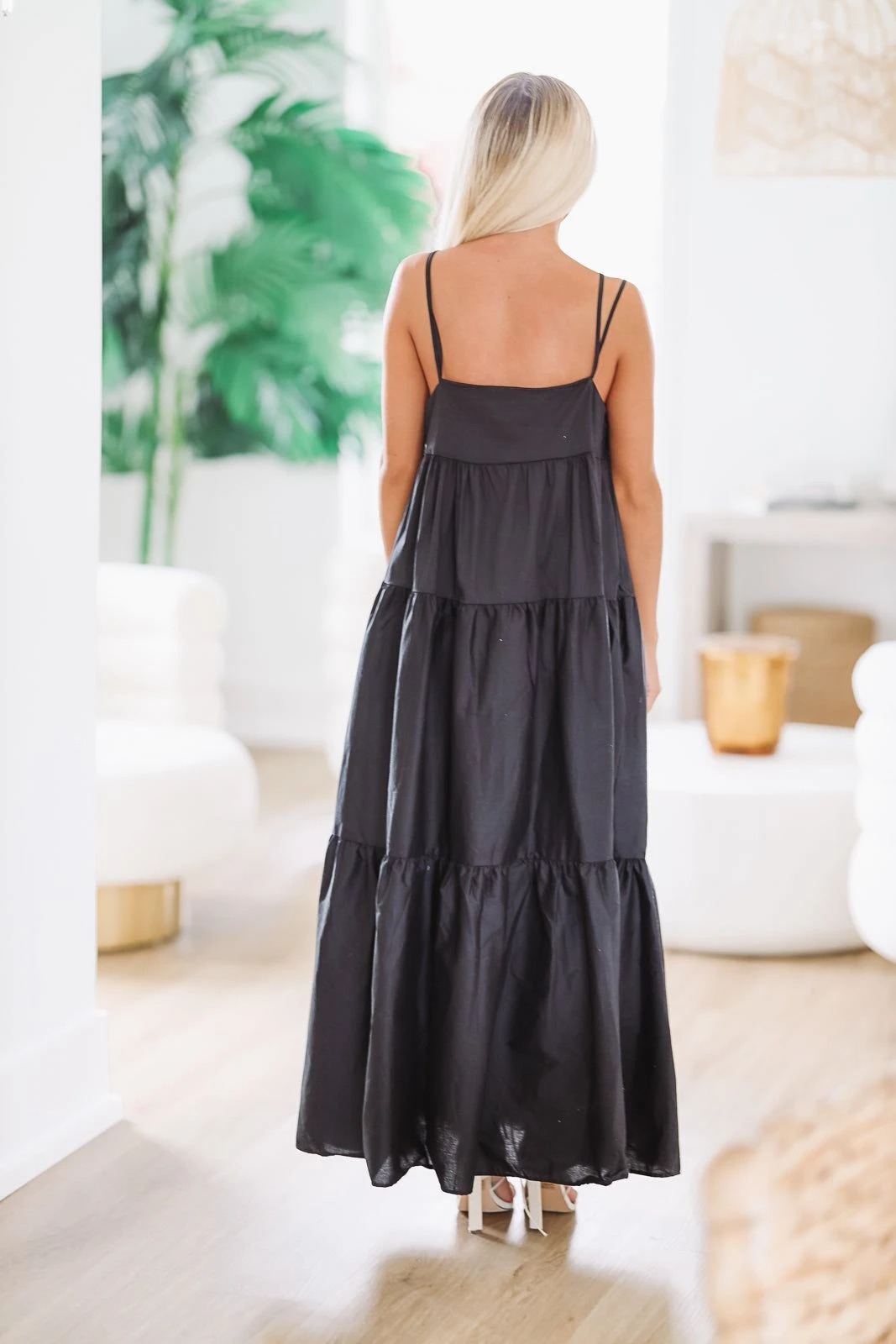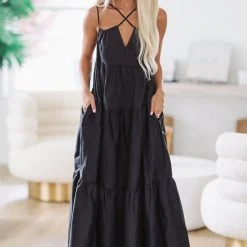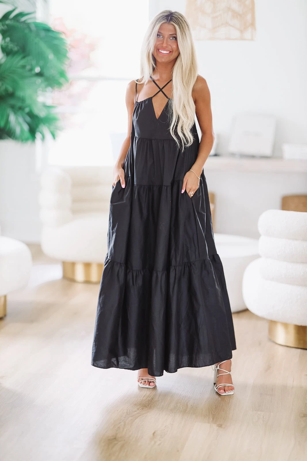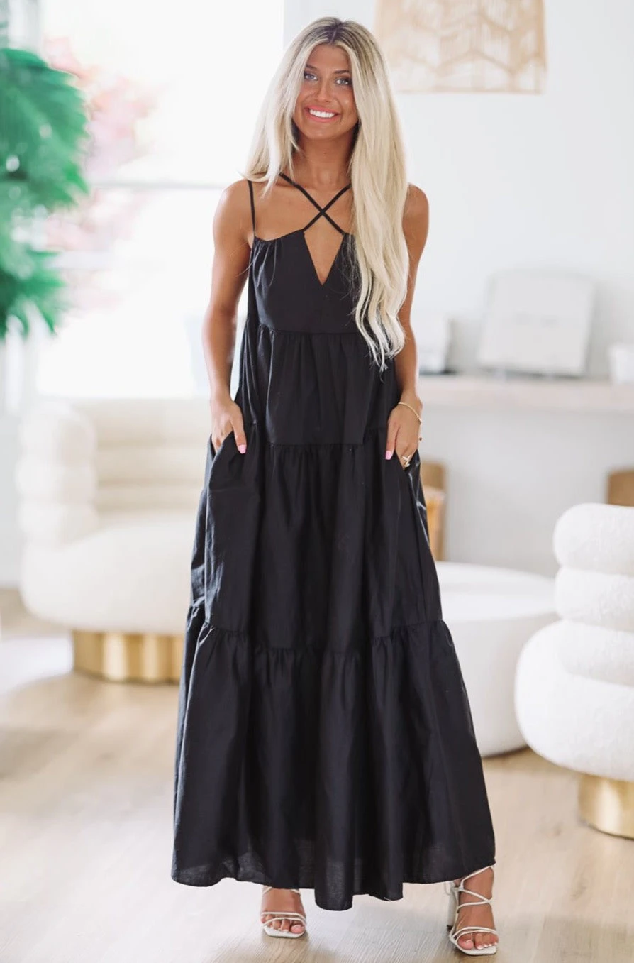 This designer dupe maxi dress is amazing. We love the tiered detailing and criss cross strappy neckline.