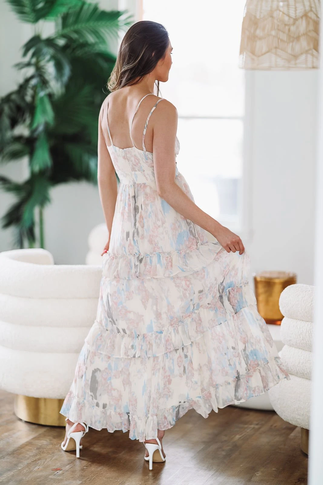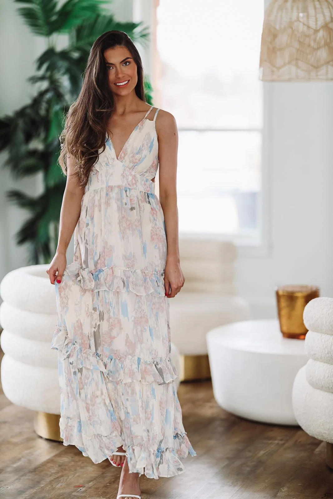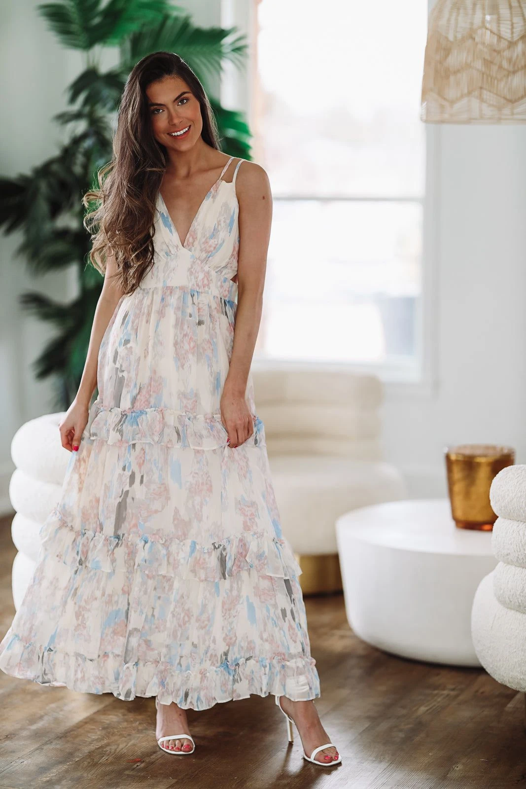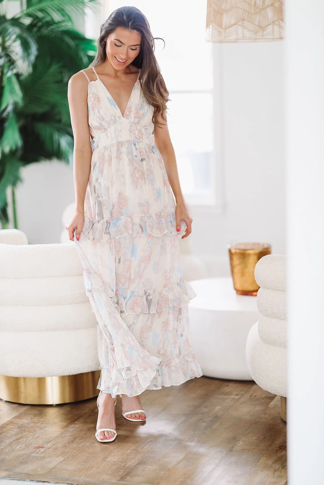 We love this floral maxi dress featuring subtle cut out detailing and cute ruffle tiers. The light floral print is so pretty and perfect for a bridal shower or to wear as a wedding guest.Â