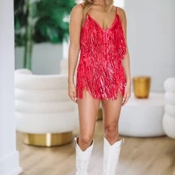 HAZEL & OLIVE Bold Moves Fringe Sequin Bodysuit – Pink
