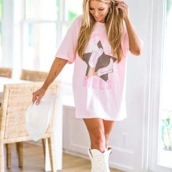 HAZEL & OLIVE Lets Go Girls Country Graphic Tee – T Shirt Dress – Light Pink